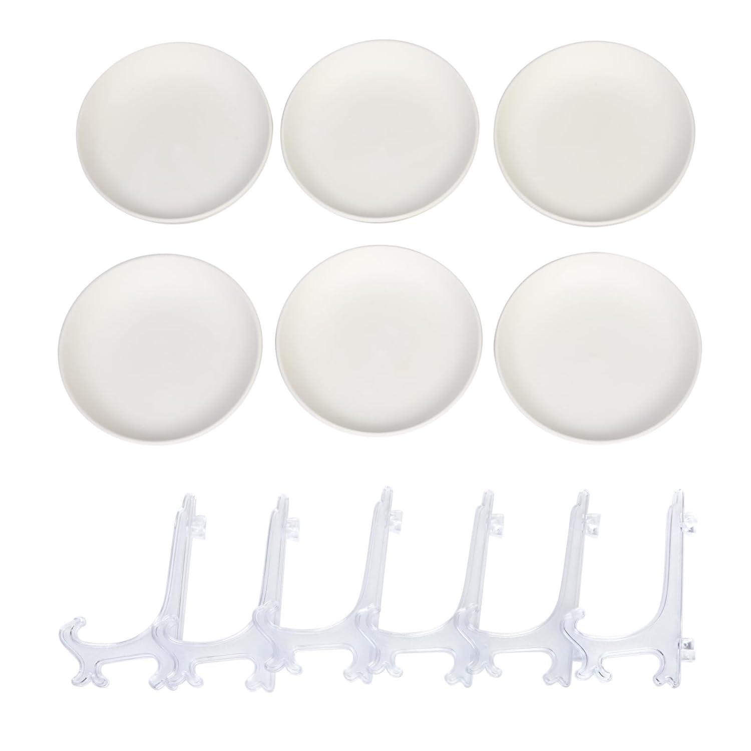 WHAT YOU GET: 6 unglazed ceramic plates with plastic display stand. Plates are 6”D.